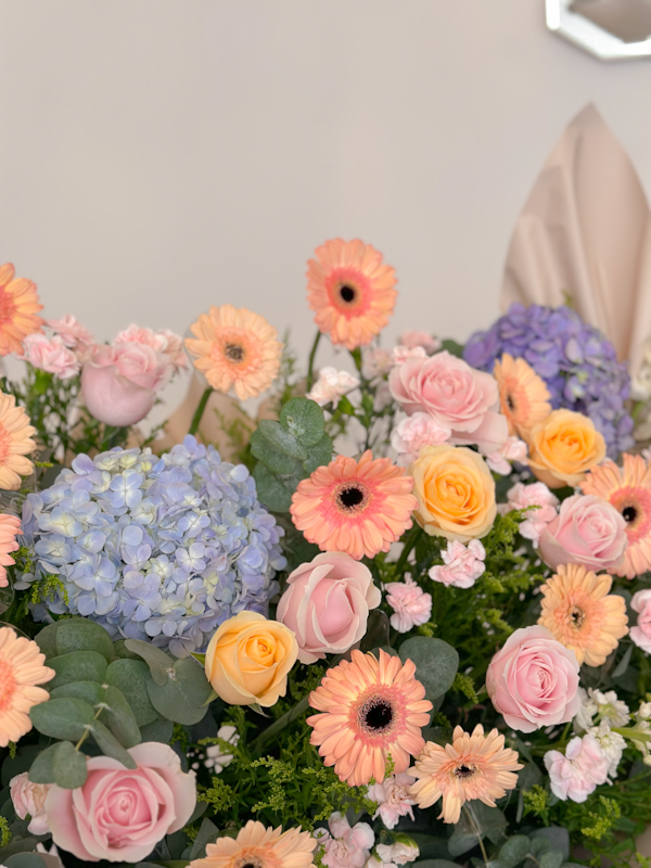 – Mixed with Matthiola, Pink Carnation Sprays, Yellow Peacock and Eucalyptus Leaves.