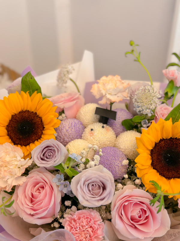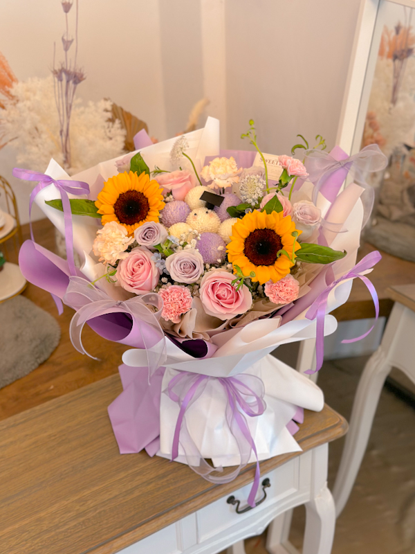 JACQUELYN Graduation Flower Bouquet is a mixed bouquet features a beautiful array of fresh and vibrant flowers such as sunflower, pink roses, lilac roses, ping pong flowers, trachymenes, and many more that are carefully selected by our expert florists that symbolise the joy and excitement of this special moment.