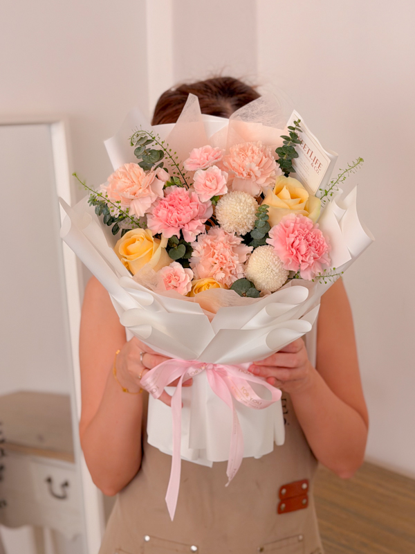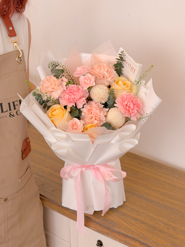 – Mixed with Pink Carnation Sprays, Eucalyptus Leaves and Green Bell