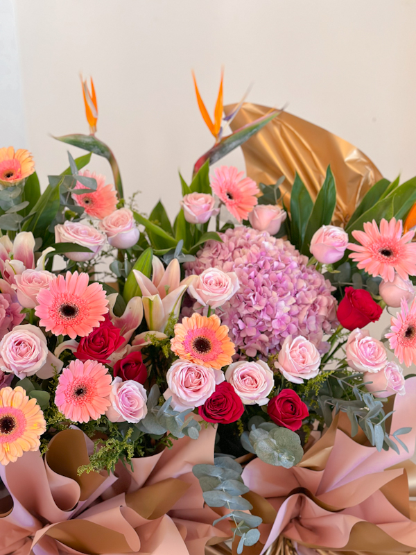 – Mixed with Bird of Paradise, Pink Lilies, Yellow Peacock, Snow White, and Eucalyptus Leaves.